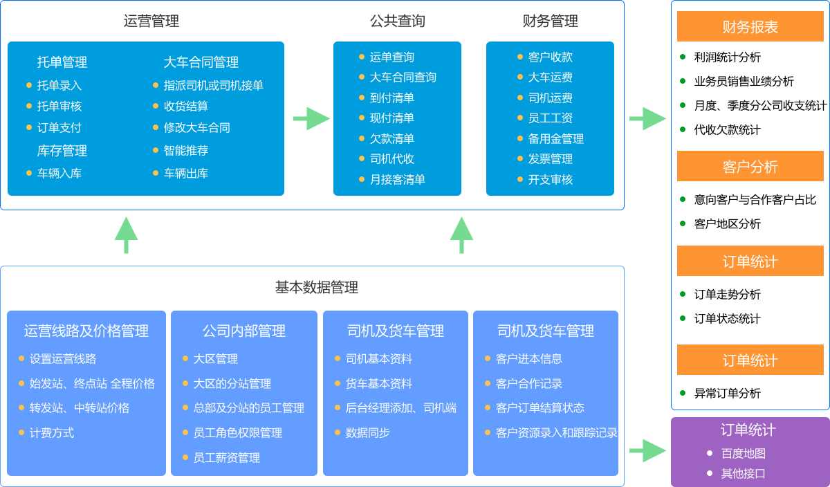 靈活多樣的配車調(diào)度方式,節(jié)約人力物力 實(shí)時(shí)定位,運(yùn)輸路線全程跟蹤,動(dòng)態(tài)軌跡回放,一目了然 預(yù)警通知,異常填報(bào),突發(fā)事件及時(shí)知曉,確保安全將貨物送達(dá) 智能拆分訂單,匹配運(yùn)輸路由 接口全兼容,完美對(duì)接各類系統(tǒng)訂單管理系統(tǒng)開發(fā)